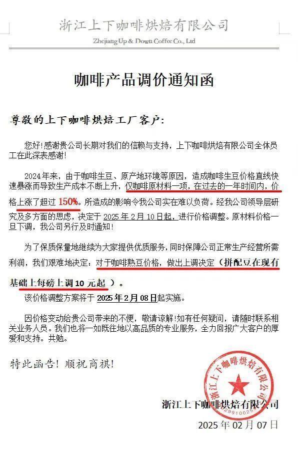 春节刚过,浙江一公司向客户发布咖啡产品调价通知函。